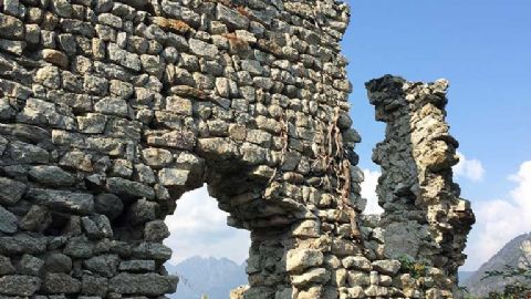 Complesso fortificato in rovina che occupa la sommità di uno sperone roccioso ubicato sulla riva orografica destra del torrente Strona