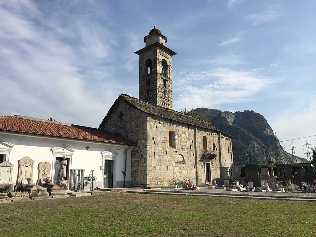 La costruzione che ancora oggi si osserva presso il cimitero è frutto di interventi architettonici del XII secolo, attuati su quell'edificio che nacque come chiesa annessa a una struttura fortificata e a una corte lungo la viabilità principale che conduceva verso l'Ossola.